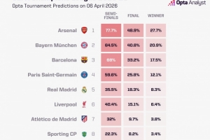 Opta超算預(yù)測(cè)歐冠(四強(qiáng)-決賽-奪冠)