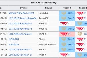 體育資訊04月08日訊 LCK常規(guī)賽,T1在Bo3中0:2不敵GEN.G。在雙方近10個(gè)大場(chǎng)交手中,T1僅在去年常規(guī)賽贏過(guò)1場(chǎng),其他都由GEN取勝。