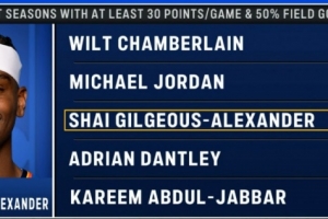 算上本賽季(場均31.3分,命中率55.4%),亞歷山大生涯第四次賽季以50%以上命中率場均砍下30+,歷史僅次于張伯倫的6次和喬丹的5次。