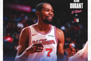 賽后,火箭官方曬出本場杜蘭特的數(shù)據(jù)海報,KD滿臉笑容。
