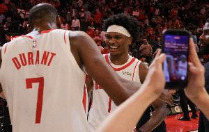 杜蘭特:“是的,我的意思是,我很喜歡他的侵略性,而且效率很高,只投丟了五六個球。對他來說這是一個美妙的夜晚,他在場上無所不能,搶籃板、傳球、防守,還投進了一些中距離。這對他來說是一場出色的比賽?!?/p>