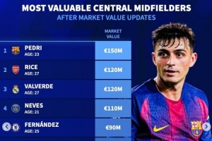 體育資訊4月11日訊 《轉會市場》統(tǒng)計了中前衛(wèi)位置球員身價情況,佩德里等4人身價均超過1億歐元。