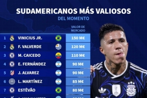 體育資訊4月12日訊 德國(guó)轉(zhuǎn)會(huì)市場(chǎng)列出了南美球員身價(jià)排名,維尼修斯1.5億歐居首,巴爾韋德1.2億歐次席。