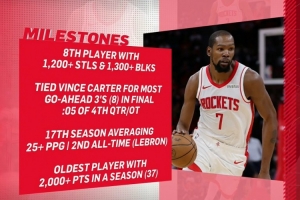 本賽季,杜蘭特場均能得到26分5.5籃板4.8助攻0.8搶斷0.9蓋帽,他還達(dá)成了以下成就: