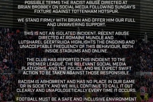 俱樂部已將此事報告給英超聯(lián)賽、相關(guān)社交媒體平臺以及警方,我們期望能迅速對責任人采取行動。種族主義是可憎的,在我們的足球運動和整個社會中沒有立足之地,只要此類事件發(fā)生,我們就會繼續(xù)清晰且毫不妥協(xié)地予以譴責。足球必須為所有人提供一個安全且包容的環(huán)境——毫無例外?!?/p>