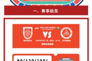 4月17日周五19:35,中超第6輪,重慶銅梁龍主場對陣深圳新鵬城的比賽在銅梁龍體育場進行,俱樂部官方發(fā)布本場票務信息,票價分為90元、120元、150元、200元以及300元5檔,開售時間為4月14日19點。